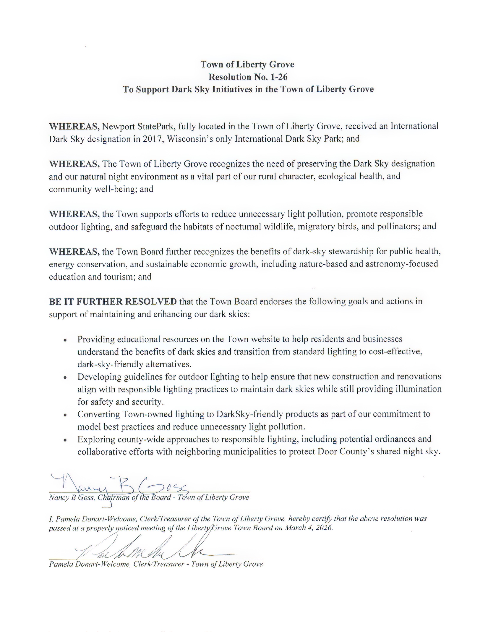 At their March 4, 2026 meeting, the Liberty Grove Town Board voted unanimously to adopt Resolution No. 1-26 To Support Dark Sky Initiatives in the Town of Liberty Grove. A copy of the full resolution is attached below.