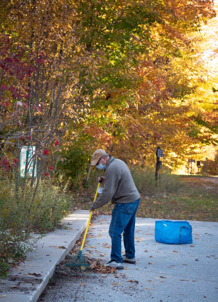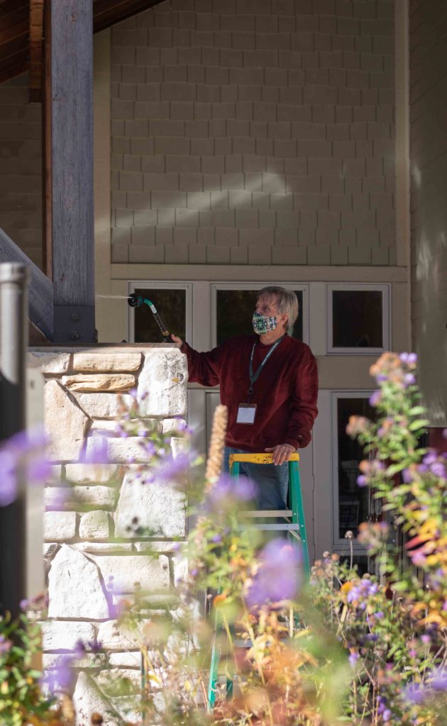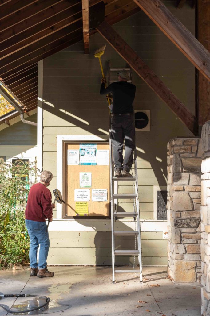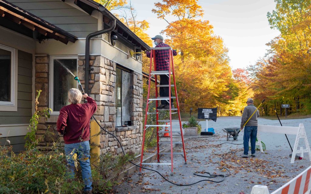 On Saturday, October 10, which happened to be one of those iconically beautiful Door County fall mornings, several Newport Wilderness Society volunteers met at the park to give the outside of the Visitors Center a much needed sprucing-up. Walls and windows were scrubbed, weeds were pulled, storm gutters cleaned out, and sidewalks were hosed down.