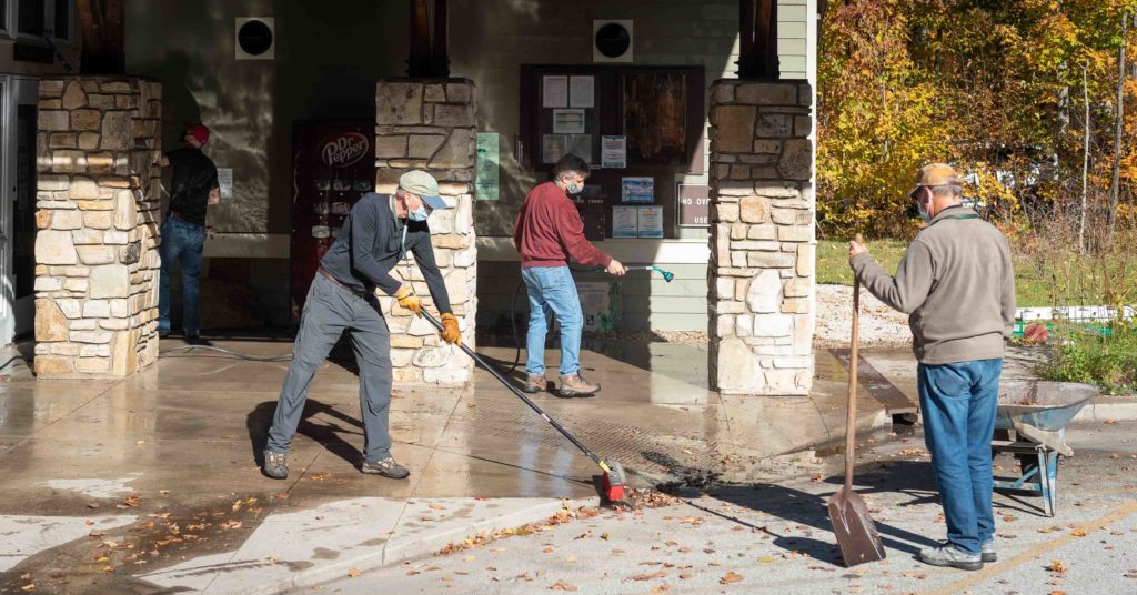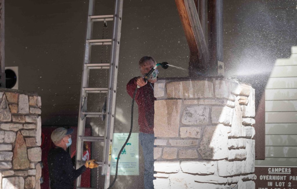 It was a socially-distanced, masked-up, small group effort organized and led by Mark Glasser. Jim Black, Deb Ford, Rick Foster, and Les Keepper participated. They worked hard to get the bulk of the work finished before the drive-up window opened at 10am. They don’t believe any park visitors were hosed down in the process!