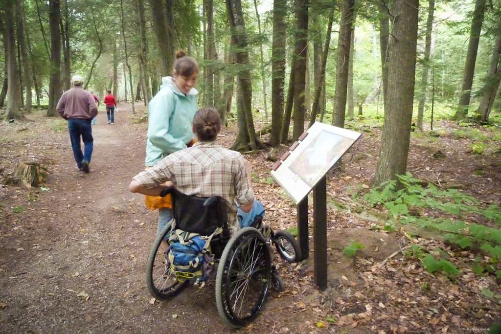 The interpretive stations include visual, auditory and tactile displays. They describe elements of the various ecosystems along the trail: the microhabitat that supports the growth of Ostrich Ferns, the geologic history of the park forests, the importance of dark skies, the importance of snags and the natural decomposition of trees, facts about birds that reside in the park.
